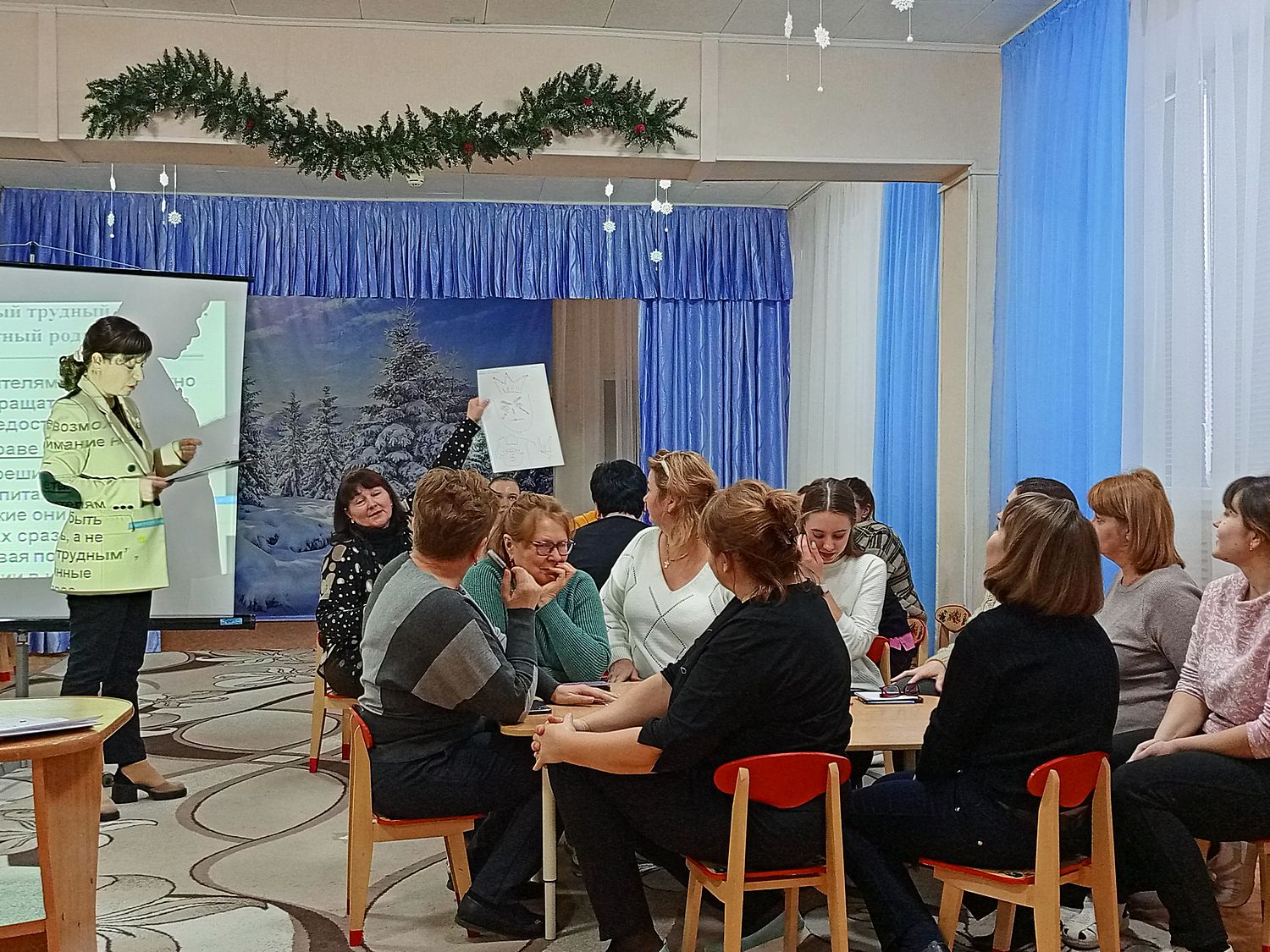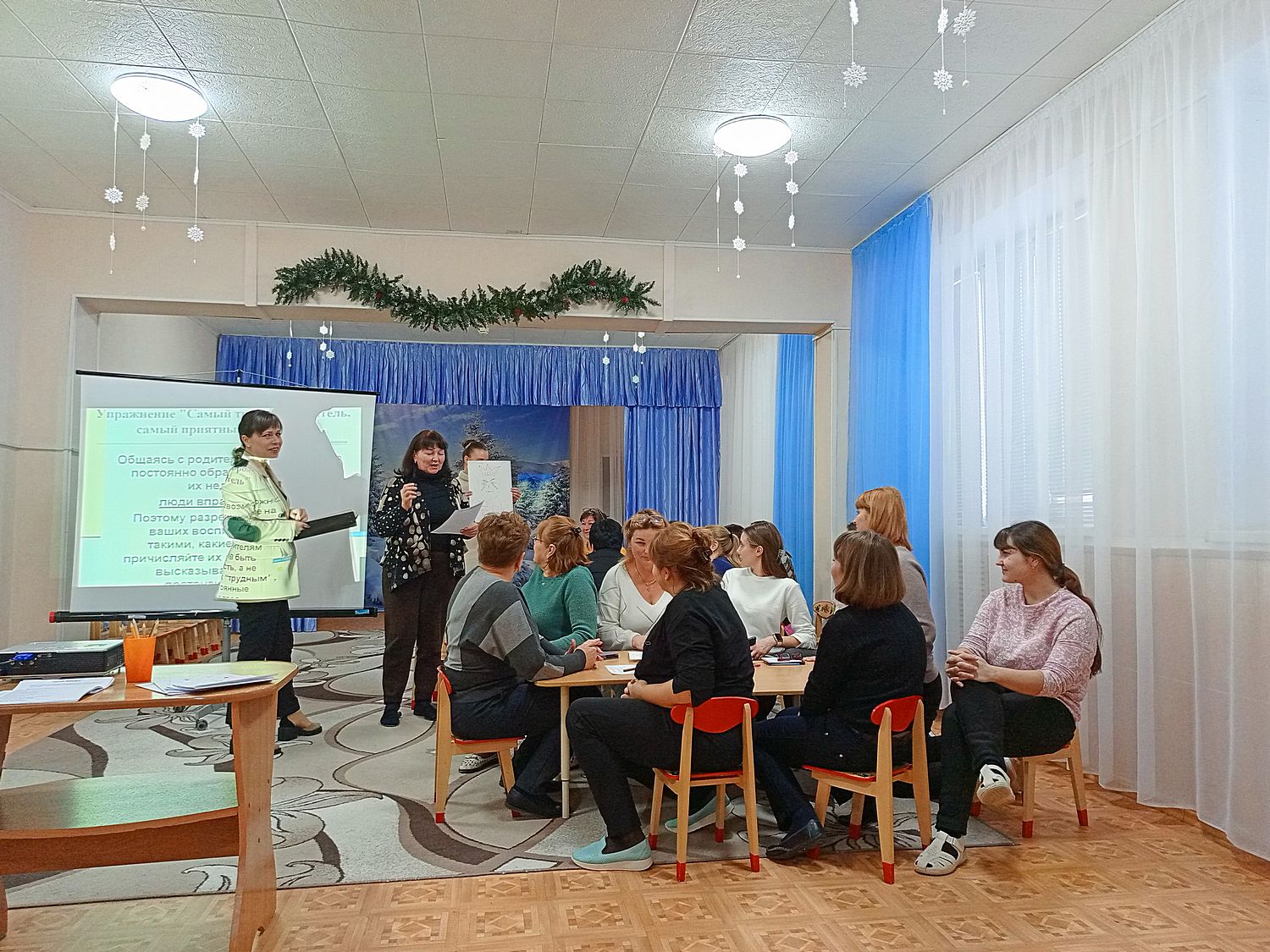 В рамках педагогического совета с педагогами ДОУ педагог-психолог И.В.Серик провела деловую игру «Профессиональная компетентность педагога в сфере общения с родителями воспитанников», которая включала в себя: разминку, тест «Испытываете ли Вы трудности в общении с родителями», упражнение «Выбери фразу», решение педагогических ситуаций, упражнения на развитие коммуникативности педагога, подведение итогов. Ирина Валерьевна подготовила памятку с Правилами общения и алгоритмом принятия педагога и дала рекомендации воспитателям «Как вести себя в конфликтной ситуации».