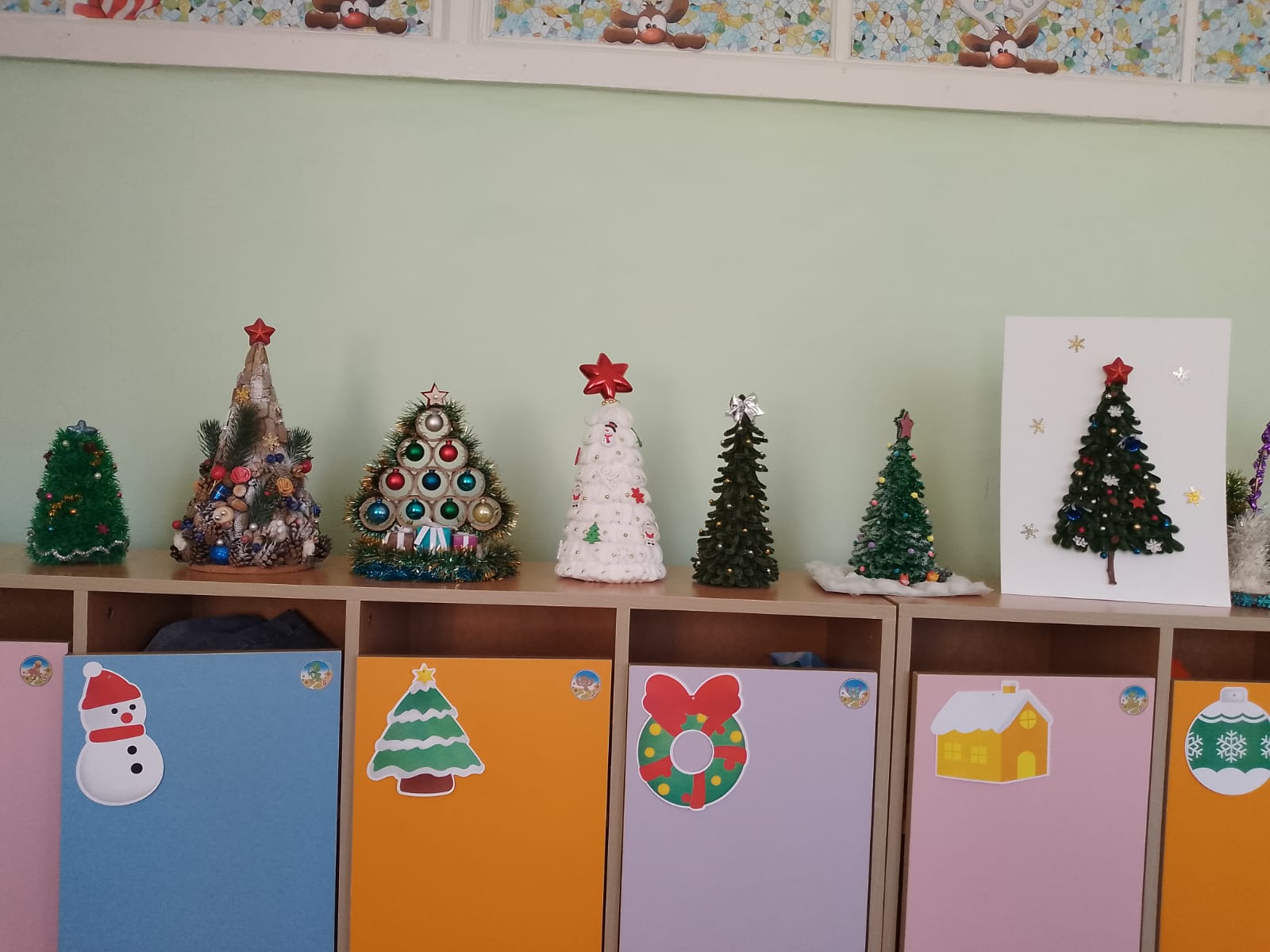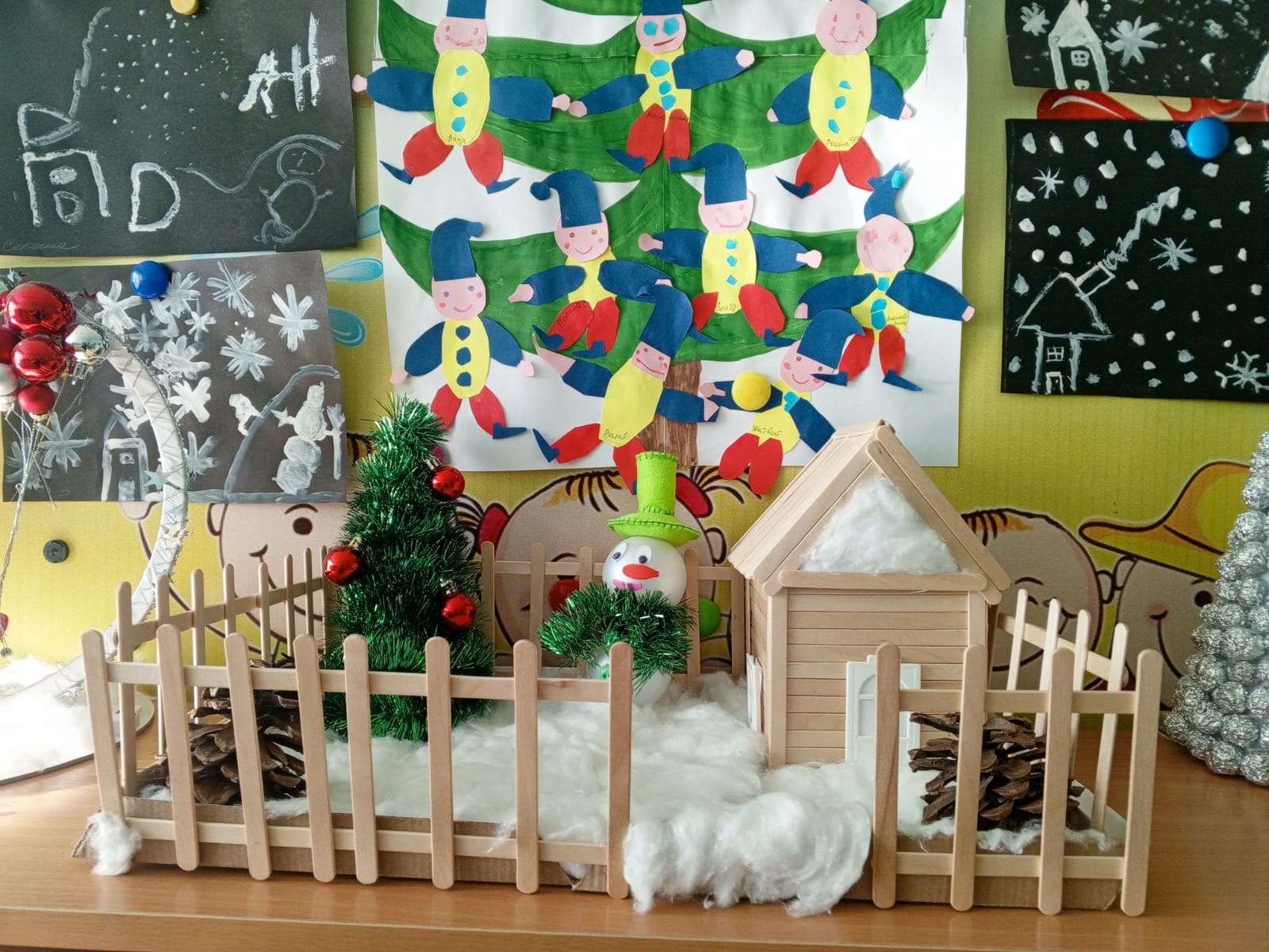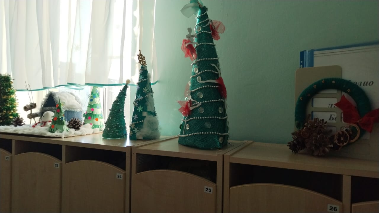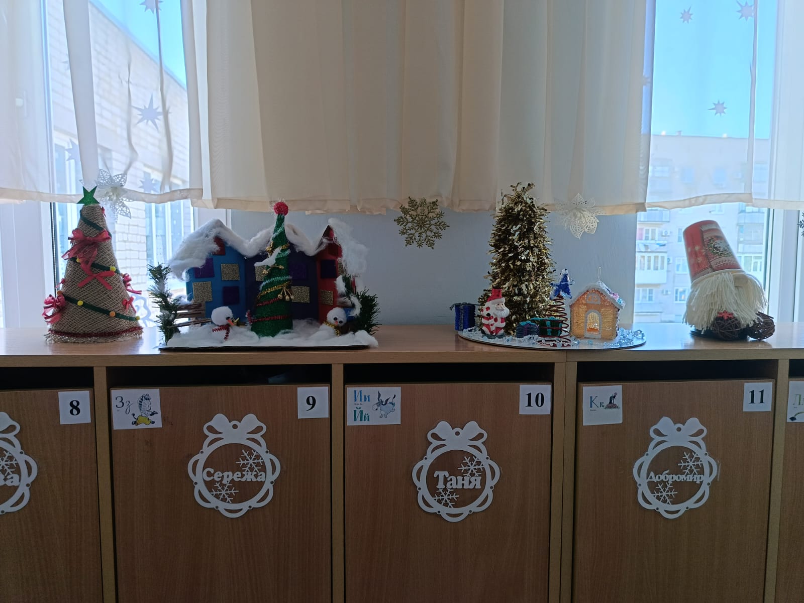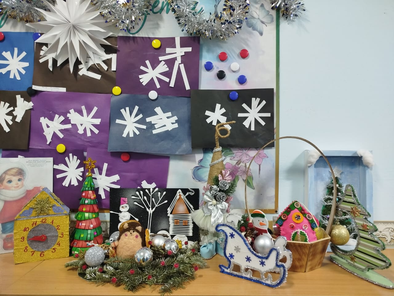 Разнообразные ёлочки, забавные снеговики, заснеженные домики, г – всё сделано руками детей и родителей.