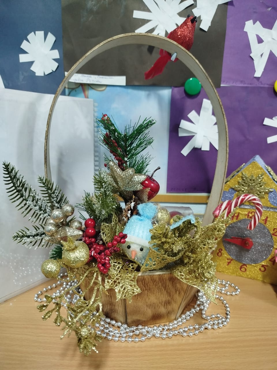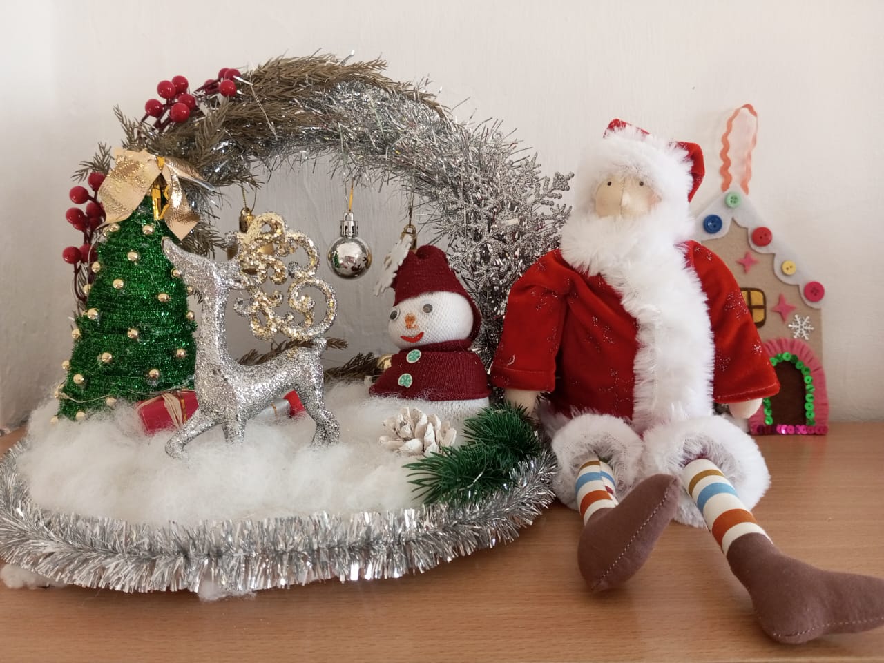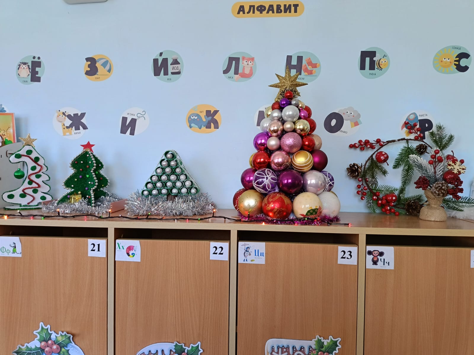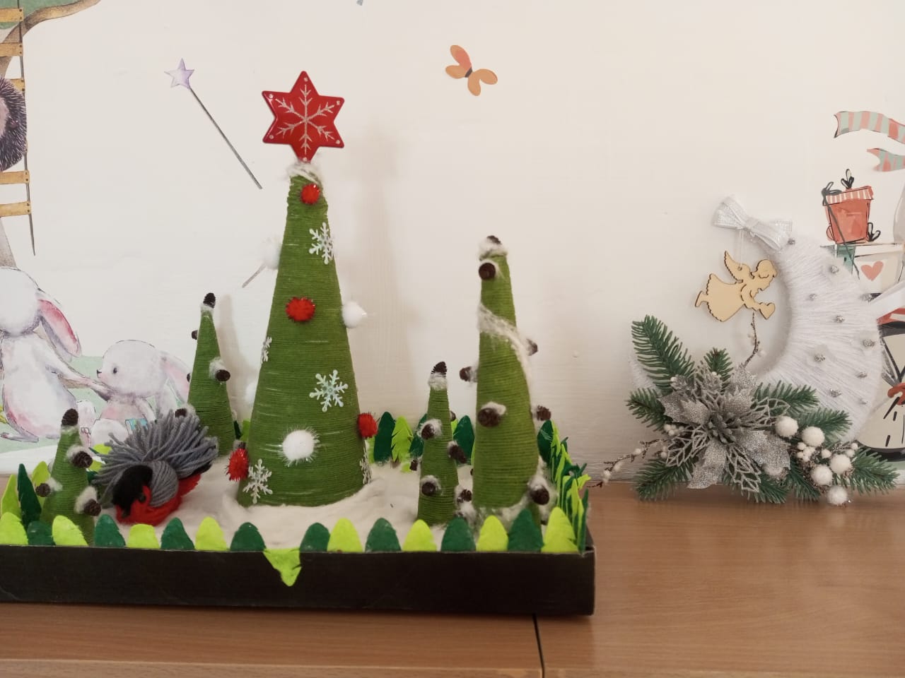Разнообразные ёлочки, забавные снеговики, заснеженные домики, г – всё сделано руками детей и родителей.