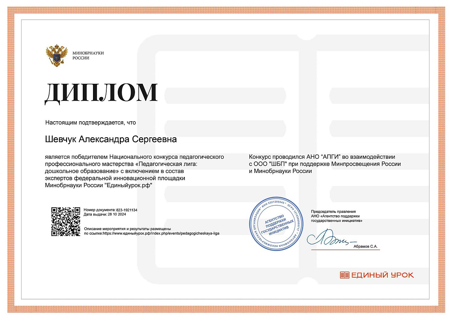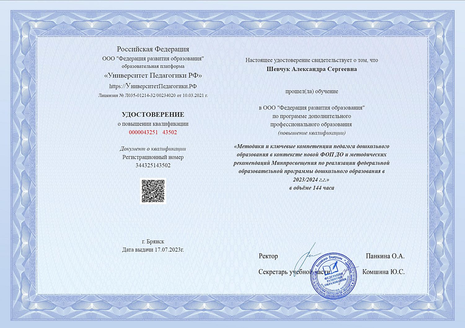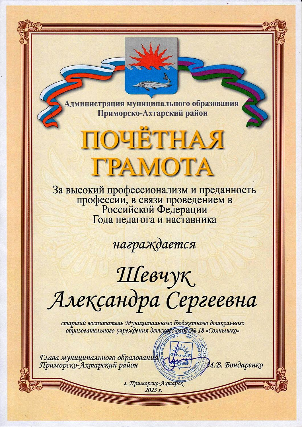 Фамилия, имя, отчество: Шевчук Александра Сергеевна